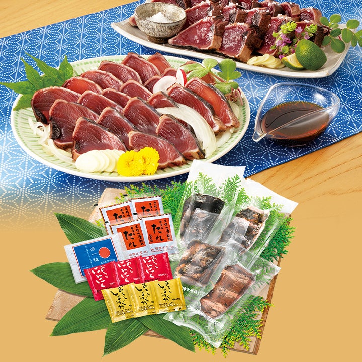 | 内容量 | 鰹たたき×4~5パック(合計約450g、太平洋海域漁獲原料使用)、タレ20ml×4、天日塩10g、おろしにんにく5g×3、おろししょうが8g×3 |