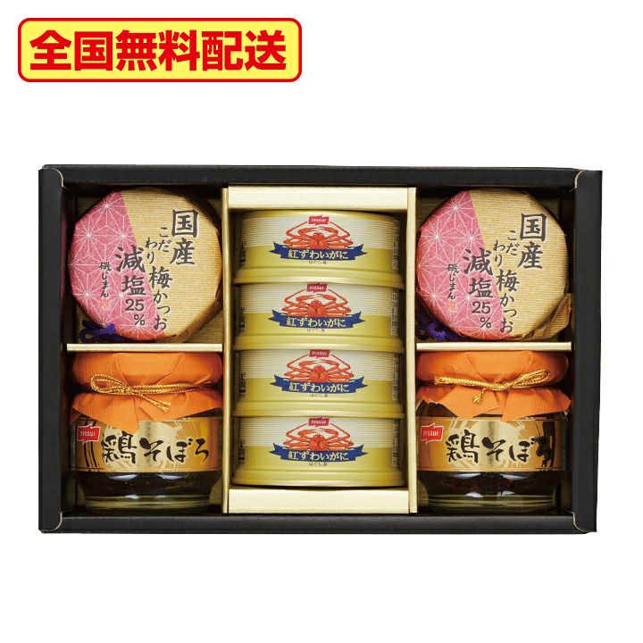 内容量ニッスイ 鶏そぼろ50g×2、紅ずわいがにほぐし身55g×4、磯じまん減塩こだわり梅かつお90g×2