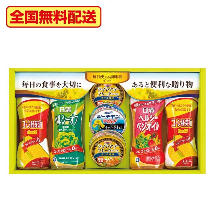| 内容量 | 日清(ヘルシーオフ・ヘルシーベジオイル)各350g、コーン油350g×2、宝幸ライトツナフレークまぐろ油70g×2、はごろもシーチキンマイルドキャノーラ70g |