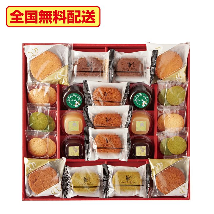 内容量ケーキ(キャラメル×3、チョコ・抹茶×各2)、マドレーヌ(プレーン・コーヒー各2)、濃厚ジュレ(ピーチ・グレープ各2)、珈琲ゼリー×2、クッキー(プレーン・抹茶各6)
