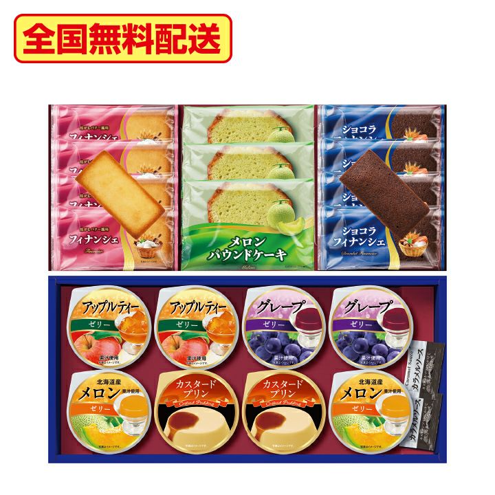 | 内容量 | プリン(カラメルソース付)×2、ゼリー(北海道産メロン果汁使用×2、アップルティー×2、グレープ×2)、フィナンシェ(プレーン・ショコラ各4)、メロンパウンドケーキ×3 |