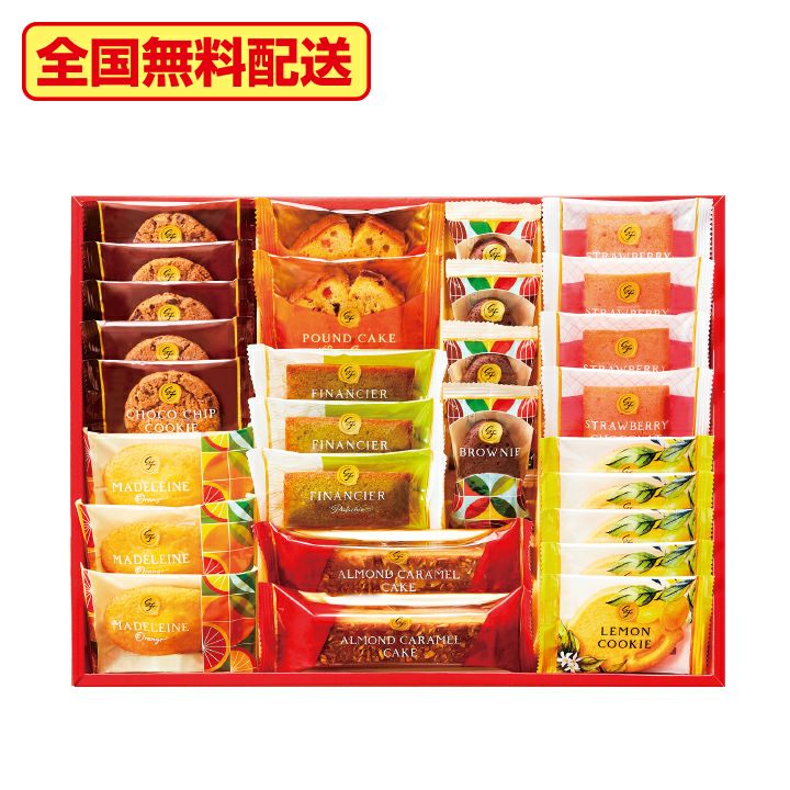 | 内容量 | オレンジマドレーヌ×3、ストロベリーショコラケーキ×4、ピスタチオフィナンシェ×3、ブラウニー×4、ブラウンシュガーパウンドケーキ×2、アーモンドキャラメルケーキ×2、チョコチップクッキー×5、レモンクッキー×5 |