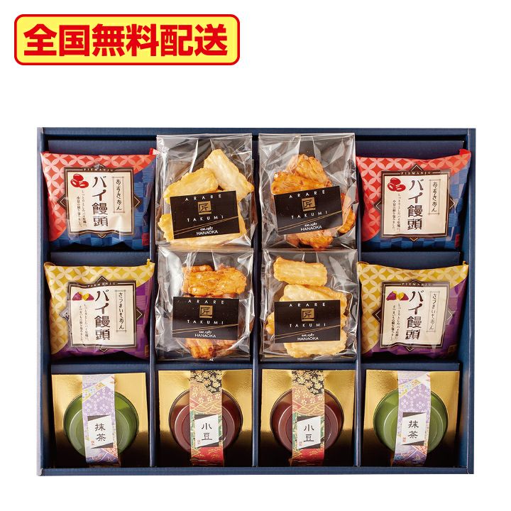 | 内容量 | パイ饅頭(小豆・さつまいも各2)、羊羹(小豆・抹茶各2)、あられ(旨塩・香ばし醤油各2) |