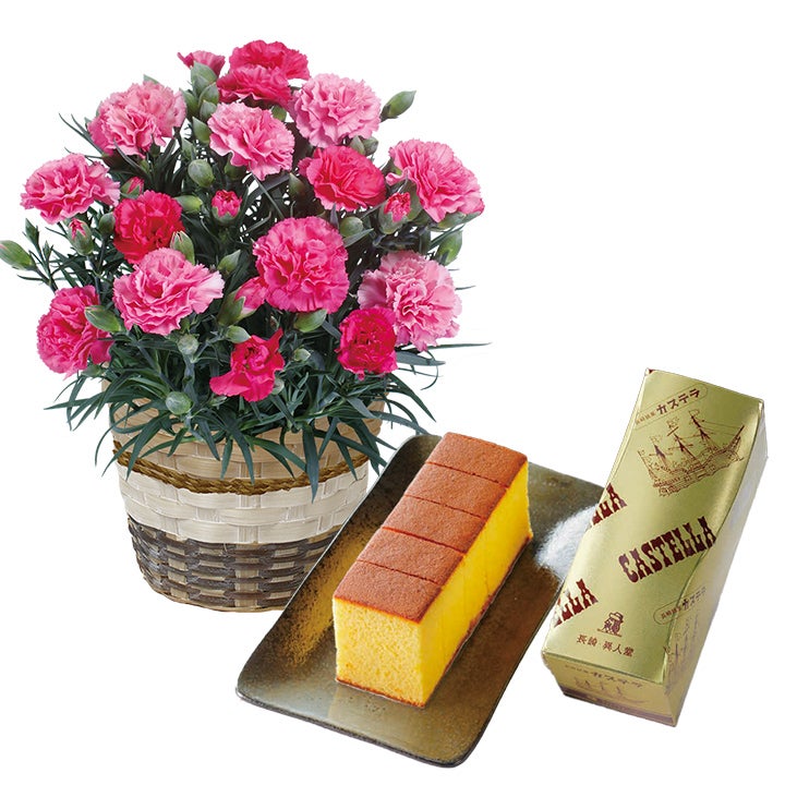 | 内容量 | 幅約19cm×高さ約35cm カーネーションさくらもなか5号鉢、長崎カステラ140g(5切) |