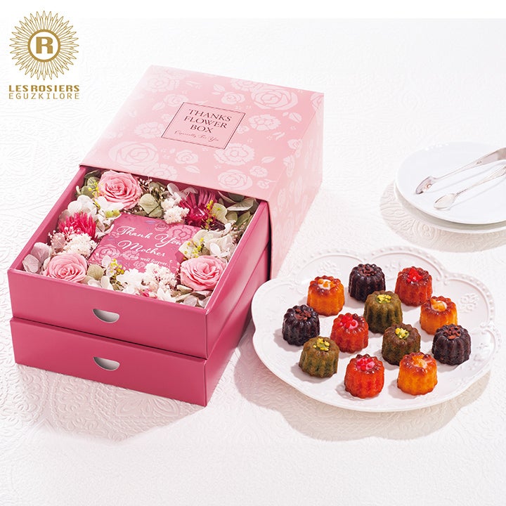 フレンチの人気店「レ ロジェ エギュスキロール」の一つ一つ丁寧にトッピングした4種のミニカヌレと華やかなプリザーブドフラワーボックスをセットにしました。