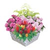 さくら色、ピンク色のミニカーネーションとカラフルなケイトウ、明るいアジアンタムを合わせた花と観葉植物を楽しめるフラワーバスケットです。※カゴのデザインが変更になる場合がございます