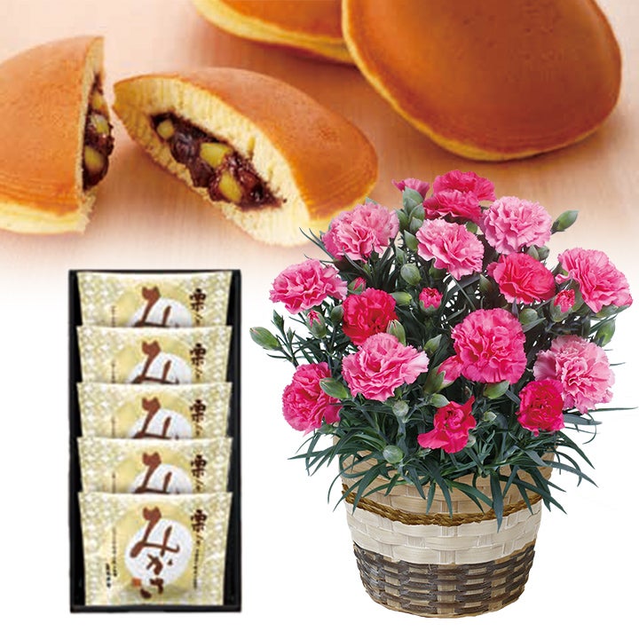 | 内容量 | 幅約19cm×高さ約35cm カーネーション5号鉢、どら焼き×5 |